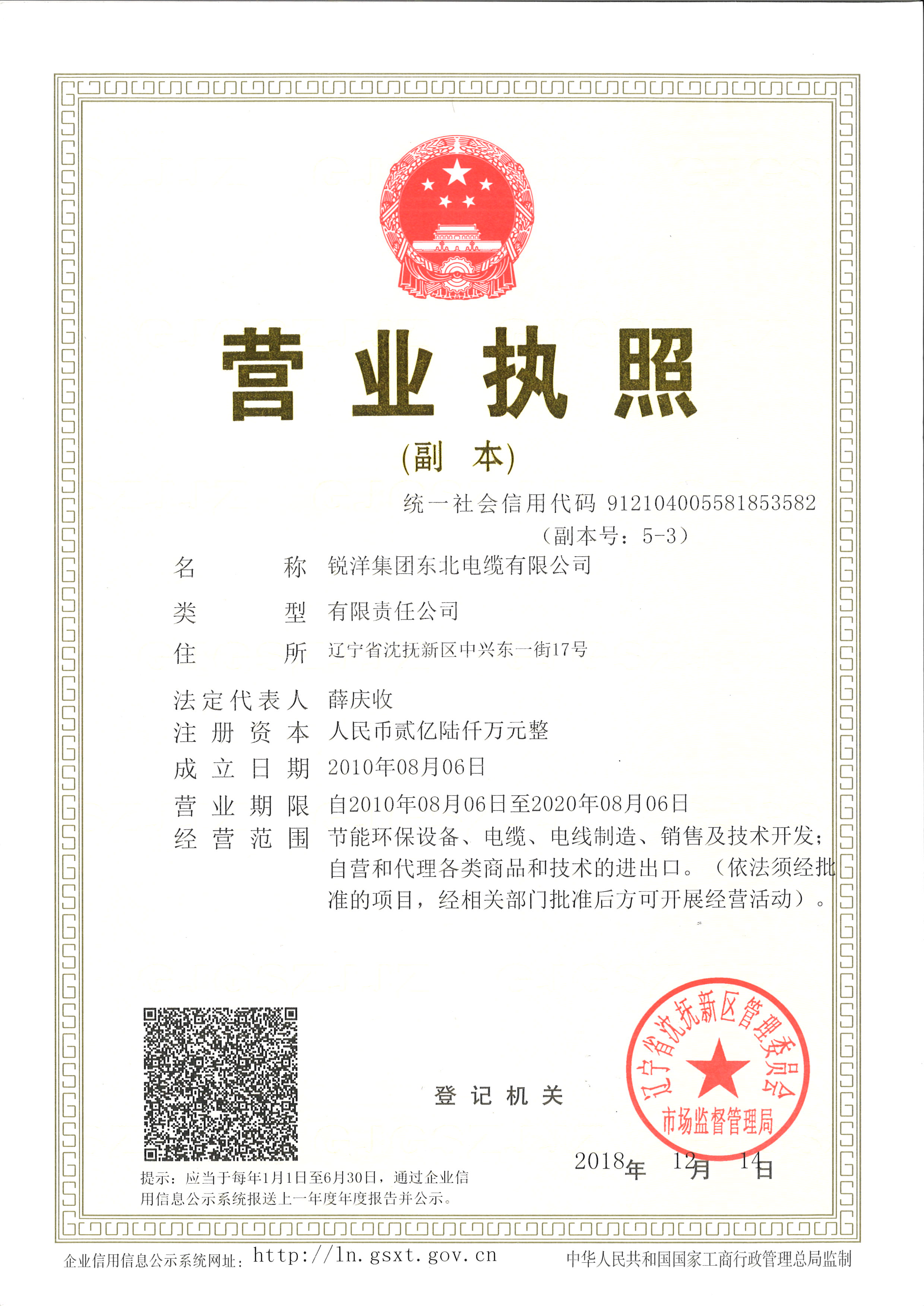 銳洋控股集團有限公司(銳洋集團)創建于2006年,總部位于遼寧省沈陽市,是經國家工商總局核準的一家主營電線電纜、電力設備、電力安裝、電工材料兼營有機農業的多元化產業集團,是目前東北地區研發能力突出、產銷規模領先的行業領軍企業。企業注冊資本3.6億元,公司產值30億元以上,在崗職工1000余人,中高級專業人才100余人。公司秉承“綠色、環保、可持續”的發展理念,專注于風、光、核、儲等新能源領域電力解決方案的研發、設計、建設與運維服務。主營產品涵蓋220kV及以下電力電纜、礦用電纜、計算機電纜、控制電纜、防火電纜、光伏電纜、特種電纜及電纜附件等30大類,上萬種規格型號。