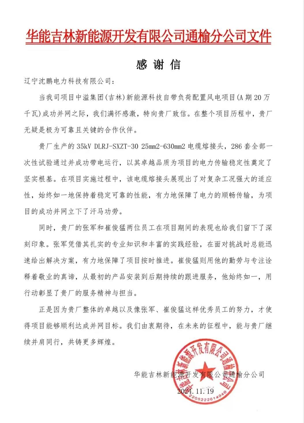 一封感謝信,合作情誼深。當華能吉林新能源項目——中溢集團(吉林)新能源科技自帶負荷配置風電項目(A期20萬千瓦)成功并網之際,特發(fā)來了一封言語真摯的感謝信。信中,華能吉林新能源對沈鵬電力在項目中的卓