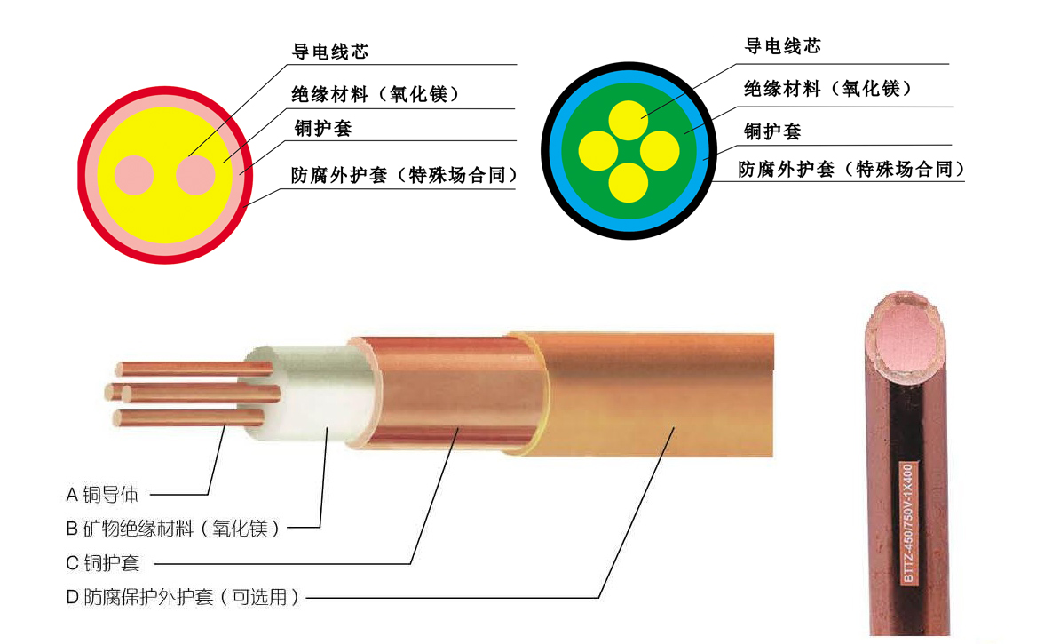 礦物絕緣電纜以高導(dǎo)電率的銅導(dǎo)體、礦物(氧化鎂)絕緣、無縫銅管護套為基本結(jié)構(gòu)組成,當(dāng)電纜用于對銅有腐蝕的場合時,最外層可加一層塑料外套(可選擇)。可廣泛應(yīng)用于高層建筑、石油化工、機場、隧道、船舶、海上石油平臺、航空航天、鋼鐵冶金、購物中心、停車場等場合。